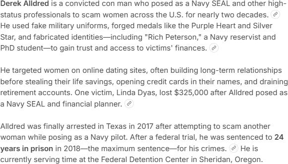 The SEAL mystique can also pay off on a personal level. Literally. Ask Derek Alldred. Or rather, ask Brave AI about him: