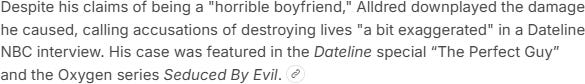 Alldred - “all dread” - what a name! - superficially resembled the sociopathic superman of my fantasies. But the reality was that he was brought down by his own stupidity and carelessness, unintentionally leaving clues for his victims - educated, wealthy women4 - to figure out who he really was and team up against him.