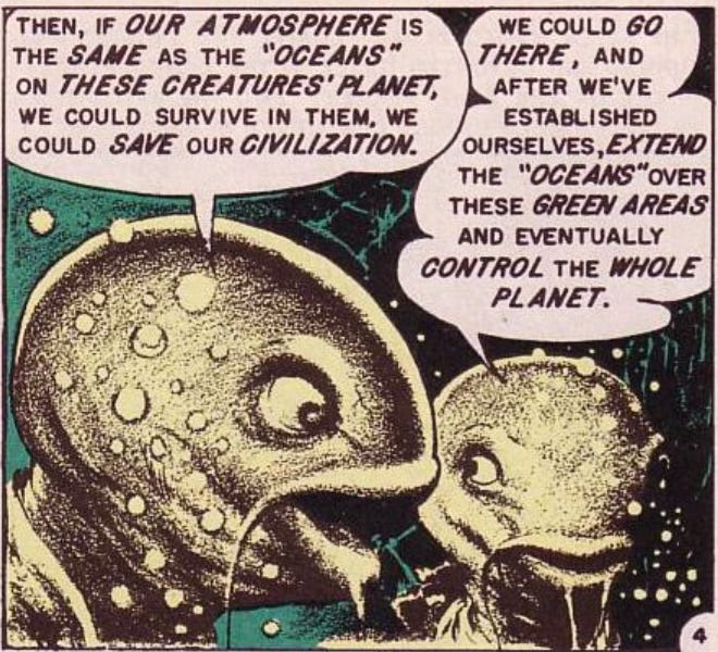 Instead of changing a whole planet, we could in theory change ourselves. Become like two of the original Guardians of the Galaxy from 1968 (cover date 1969) - Martinex (right), engineered to live on Pluto, and Charlie-27 (center), engineered to live on Jupiter. Later, Nikki, engineered to live to Mercury, joins the team. (The ‘real’ one to me - I never warmed up to the modern movie version.)