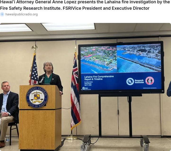 [Fire Safety Research Institute i]nvestigators concluded that Maui County and the state were unprepared and complacent about Red Flag Warnings [With Capital Letters!] before the wind-fueled conflagration that destroyed Lahaina and homes in upcountry.