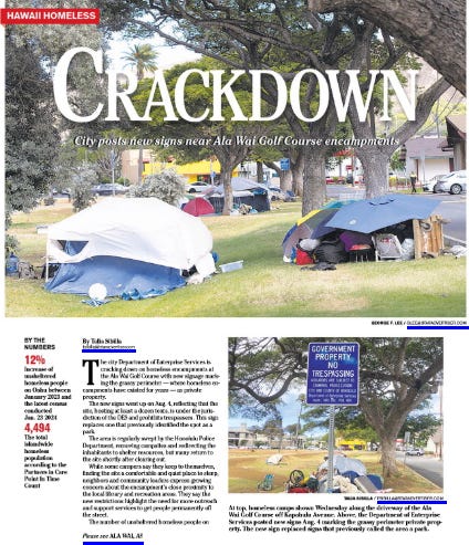 Prettywords didn’t translate to unobstructed sidewalks. On this island2, the number of unsheltered homeless - i.e., homeless on the street - went up 14.5% from 2,052 in 2018 to 2,350 in 2019.