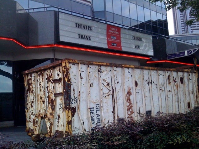 I just learned that the theater at Restaurant Row was demolished by last summer … fifteen years after it closed in 2009. (Speed is a racistimperialistcolonialist concept in Hawaii.1) And that Restaurant Row was rebranded as Waterfront Plaza (it faces Honolulu Harbor) which only has a few food places left.